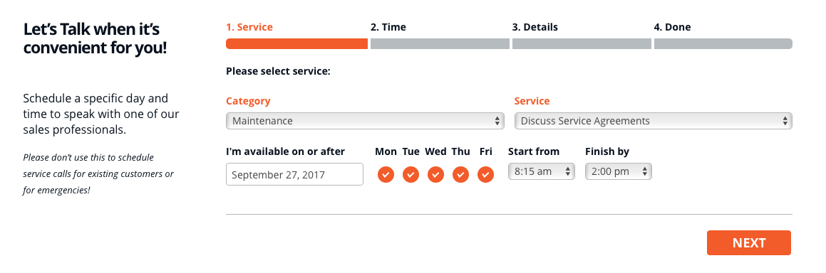 Up to this point, their sales and service departments had been operating in a traditional and limiting fashion. Seeing an opportunity, we built functionality into the website that allowed potential and existing customers to schedule service and maintenance at their convenience. It has also enabled the sales force to become more efficient at responding more quickly to client needs. - Value Proposition and Services Clearly Explained